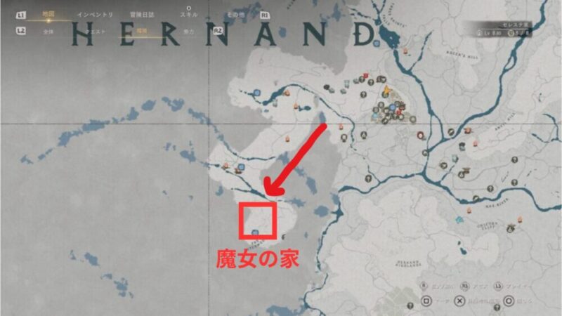 エルナンドから南西、マークの位置あたりが「魔女の家」です。